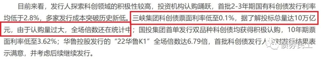 2022年5月20日,上海證券交易所印發了《上海證券交易所公司債券發行上市審核規則適用指引第4號——科技創新公司債券》,正式推出科技創新公司債券。科技創新公司債券推出之后,即得到了發行人和投資者的廣泛關注和認可。根據證券日報2022年5月29日的報道(http://www.zqrb.cn/stock/gupiaoyaowen/2022-05-29/A1653813408733.html),三峽集團科創債票面利率低至0.1%,投標總量達10萬億元!!!