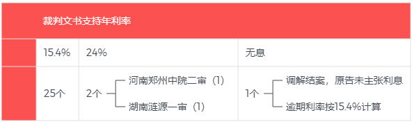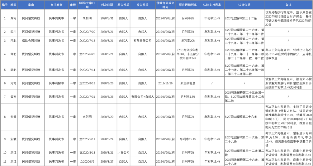 好奇心驅(qū)使下,我們通過“中國裁判文書網(wǎng)”,以“全文:15.4%”“裁判日期:2020-08-20 TO 2020-09-02”以及相關(guān)案由名稱為檢索條件,進(jìn)行了“地毯式”案例檢索,獲得了28份裁判文書。在剔除一份與“四倍LPR”不相關(guān)判決書,以及加入3808判決后,我們形成了28份裁判文書作為研究樣本。