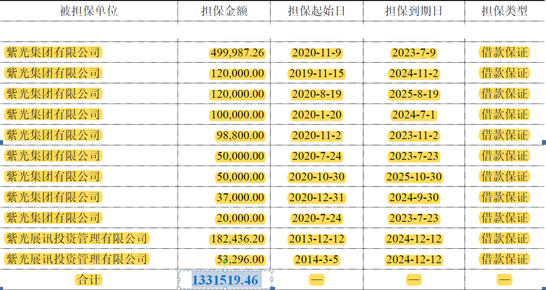 第一,對紫光集團及其下屬紫光展訊投資管理有限公司(以下稱“紫光展訊”)的長期借款提供的無限連帶責(zé)任擔(dān)保,總擔(dān)保金額133.1519億元。其中對紫光集團本級的擔(dān)保金額109.58億元,全部發(fā)生在2019年11月-2020年11月期間。