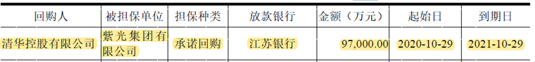 第二,為江蘇銀行于2020年10月29日為紫光集團發(fā)放的一筆97000萬元一年期的貸款提供到期無條件回購承諾,到期時間為2021年10月29日。