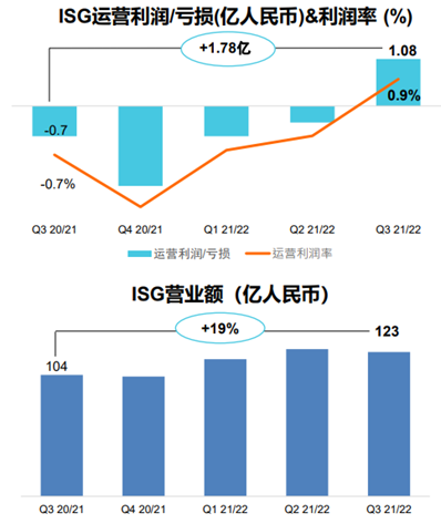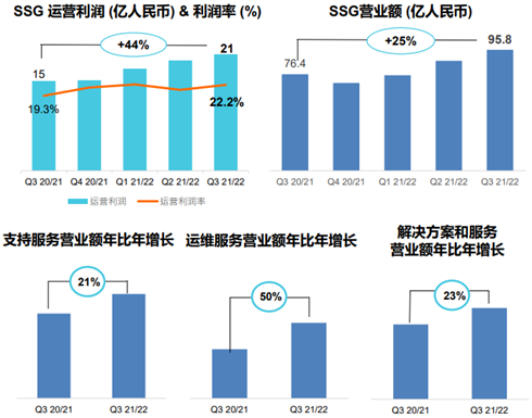 根據(jù)財(cái)報(bào),2021年第四季度,聯(lián)想單季實(shí)現(xiàn)營(yíng)業(yè)收入首次突破200億美元大關(guān),同比增長(zhǎng)16%,至1287億人民幣;凈利潤(rùn)達(dá)40.9億人民幣,同比增長(zhǎng)62%,再創(chuàng)歷史新高。值得注意的是,聯(lián)想的凈利潤(rùn)已連續(xù)6個(gè)季度同比增長(zhǎng)超過(guò)50%,盈利能力持續(xù)提升。同時(shí),凈負(fù)債則持續(xù)減少,凈現(xiàn)金流為5.2億人民幣,系5年來(lái)首次轉(zhuǎn)正。ISG繼2014年收購(gòu)IBM x86服務(wù)器業(yè)務(wù)以來(lái),首次實(shí)現(xiàn)單季盈利,運(yùn)營(yíng)利潤(rùn)達(dá)1.08億人民幣,取得了里程碑式的成就。七年磨一劍,終于扭虧為盈,步入發(fā)展的快車道。聯(lián)想的另一塊專注于行業(yè)智能與服務(wù)的SSG(Solutions & Services Group,方案服務(wù)業(yè)務(wù)集團(tuán)),業(yè)績(jī)同樣很出彩。第三財(cái)季,SSG的收入95.8億人民幣,同比增長(zhǎng)25%;實(shí)現(xiàn)運(yùn)營(yíng)利潤(rùn)21億人民幣,同比大幅增長(zhǎng)44%。要知道,SSG的收入占比僅有7.4%,而運(yùn)營(yíng)利潤(rùn)占比卻高達(dá)19.4%,未來(lái)發(fā)展空間巨大。