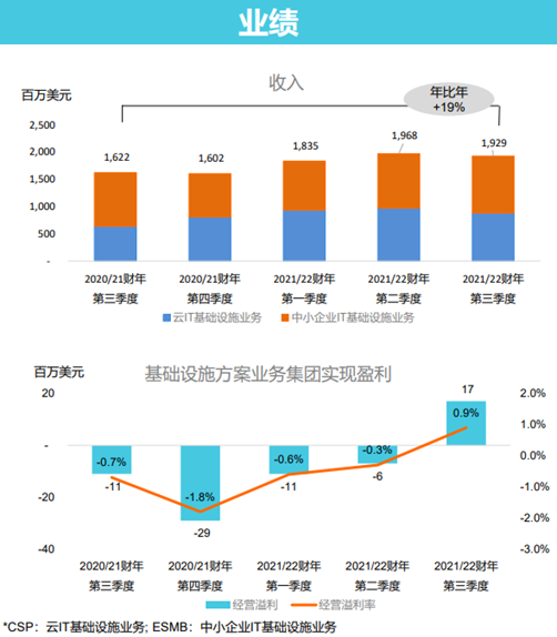 第三財(cái)季,IDG實(shí)現(xiàn)收入1126億人民幣,同比增長(zhǎng)16%;實(shí)現(xiàn)運(yùn)營(yíng)利潤(rùn)86.4億人民幣,同比增長(zhǎng)21%。伴隨著政策的東風(fēng),聯(lián)想的轉(zhuǎn)型迎來(lái)全新面貌,IDG穩(wěn)中有升作為“中軍”,而ISG和SSG則充當(dāng)轉(zhuǎn)型期的“先鋒”,整個(gè)集團(tuán)的超預(yù)期業(yè)績(jī)也證明了聯(lián)想轉(zhuǎn)型的成功。2021/2022財(cái)年第三季度業(yè)績(jī)會(huì)上,童夫堯介紹到,聯(lián)想幾乎所有的員工都在從傳統(tǒng)的硬件銷售進(jìn)一步升級(jí),向客戶推薦聯(lián)想的高價(jià)值產(chǎn)品。除了服務(wù)器之外,還有存儲(chǔ)、軟件定義、網(wǎng)絡(luò)、解決方案、增值服務(wù)等。