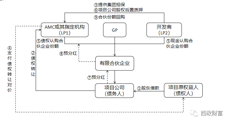 2.AMC或其指定主體與開發(fā)商共同設立有限合伙企業(yè),合伙企業(yè)的GP由AMC指定,AMC或其指定主體以收購的項目原權益人的債權認購有限合伙企業(yè)的份額,開發(fā)商以現金認購有限合伙企業(yè)的份額,具體份額比例可另行協商,有限合伙收購項目公司股權之后做后置質押。