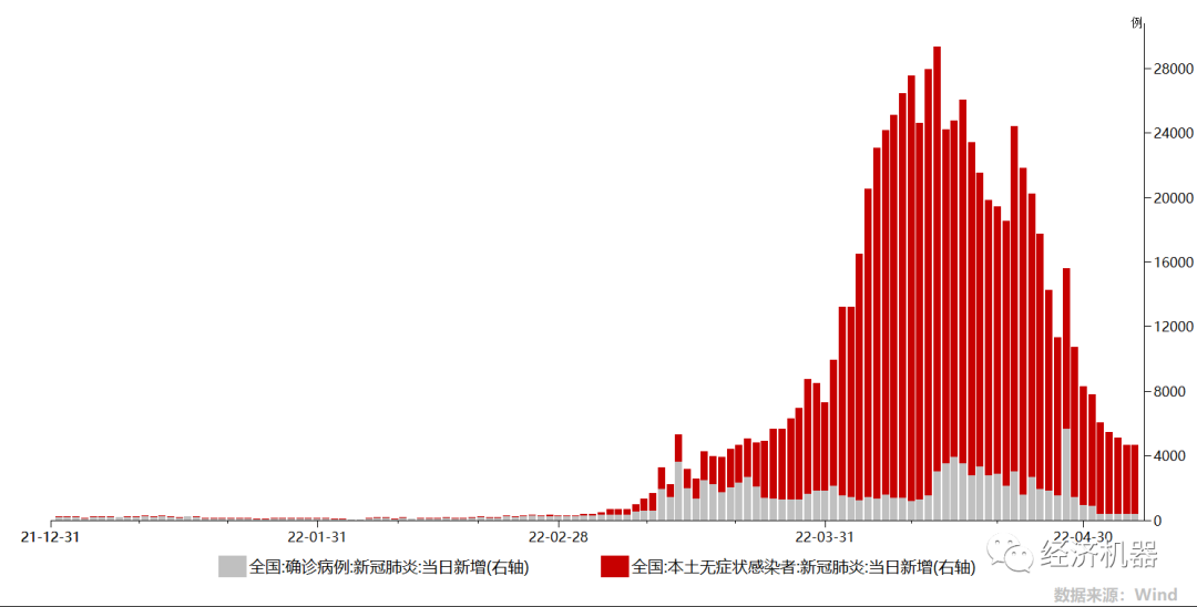 疫情防控:這波高峰已過,正在邊際好轉。我國每日新增確診人數(shù)和無癥狀感染人數(shù)從高峰期的接近3萬人,降至目前4000人左右(圖1),基本得到控制。隨著后續(xù)核酸檢測常態(tài)化,或會找到一條動態(tài)清零與經(jīng)濟的共存之路。
