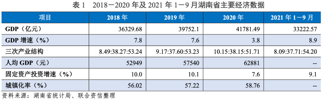 湖南省整體經濟實力較強,經濟總量位于全國中等偏上水平,人均GDP處于全國中等水平,經濟發展態勢良好。2021年前三季度,隨著“新冠”疫情影響的逐步減弱以及固定資產投資的回暖,湖南省經濟水平大幅回升。2020年,湖南省一般公共預算收入規模處于全國各省市自治區中上游水平,財政自給能力偏弱,整體財政實力一般;湖南省負債率及債務率在全國各省(自治區、直轄市)中均處于相對較高水平,債務負擔相對較重。
