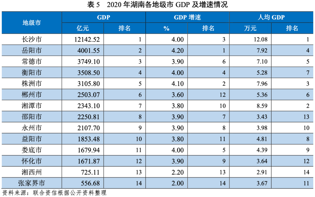 湖南省長株潭地區、湘南地區、湘北地區和湘西地區經濟實力分化程度較高,長株潭地區經濟實力明顯高于其他地區,湘西地區經濟實力較弱;長沙市作為湖南省省會城市,經濟實力及增速均處于全省領先地位,為全省唯一GDP規模超萬億的地級市。
