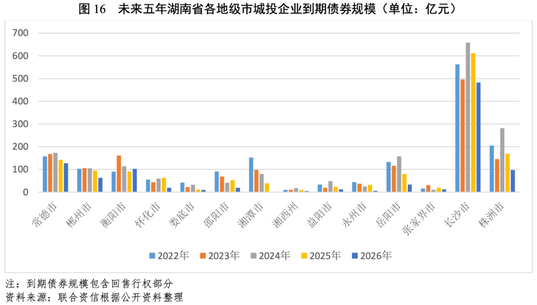 從湖南省各地級市發債城投企業未來五年(2022-2026年)到期債券規模看,長沙市、株洲市和常德市的城投企業未來三年集中到期債券規模大,湘西州、益陽市、張家界市和婁底市城投企業到期債券規模相對較小,各地級市未來五年債券到期規模整體處于波動下降趨勢,債務償還日期主要集中在2022-2024年。