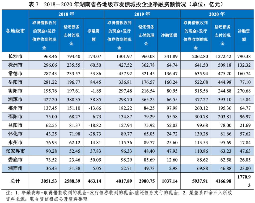 整體看,2018-2020年,湖南省發債城投企業“取得借款收到的現金+發行債券收到的現金”和融資額凈流入規模持續大幅增長,除湘潭市和婁底市外的各地級市發債城投企業呈現債務擴張趨勢,資金主要流入長沙市高信用級別城投企業;湘潭市發債城投企業償債規模持續處于高位,隨著“取得借款收到的現金+發行債券收到的現金”的波動下降,融資額由凈流入轉為凈流出,債務呈現收縮趨勢。湖南省發債城投企業整體保持較好的融資狀況。
