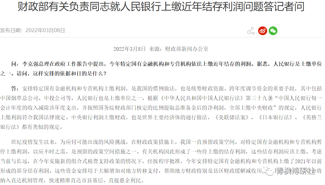 (一)政府工作報告和財政預算報告均明確今年的財政支出擴大主要得益于特定國有金融機構(gòu)和專營機構(gòu)上繳的結(jié)存利潤實現(xiàn)。這就意味著,央行是屬于特定國有金融機構(gòu)和專營機構(gòu)的,這個應沒有異議。
