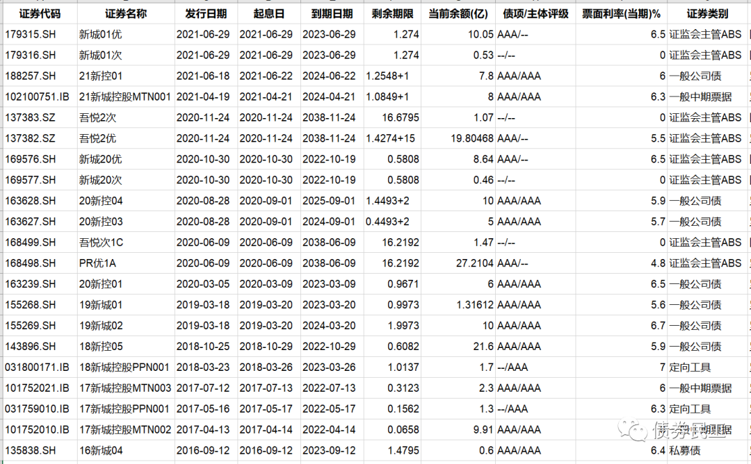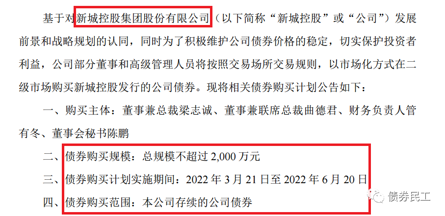 2、新城控股集團(tuán)股份有限公司3月18日公告,公司部分高管以市場(chǎng)化方式在二級(jí)市場(chǎng)購買不超過2000萬元本公司發(fā)行的公司債券。目前新城控股存續(xù)債券21只,包括公司債券、資產(chǎn)證券產(chǎn)品、中期票據(jù)和定向工具。其中存續(xù)公司債券8只,存續(xù)公司債券金額為62.32億元。新城控股最近一次發(fā)行債券是在2021年6月29日發(fā)行了規(guī)模為2.548億元的“新城01優(yōu)”、“新城01次”。