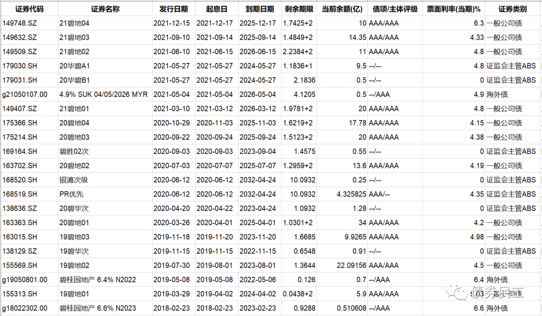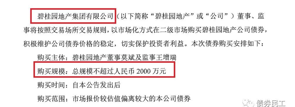 1、碧桂園地產(chǎn)集團(tuán)有限公司于2022年3月17日公告,公司部分董事和監(jiān)事以市場(chǎng)化方式在二級(jí)市場(chǎng)購買不超過2000萬元本公司發(fā)行的公司債券。目前碧桂園存續(xù)債券21只,包括公司債券、資產(chǎn)證券產(chǎn)品和美元債券。其中存續(xù)公司債券10只,存續(xù)公司債券金額為165.05億元。碧桂園最近一次發(fā)行債券是在2021年12月15日發(fā)行了規(guī)模為10億元的“21碧地04”,票面利率6.3%。
