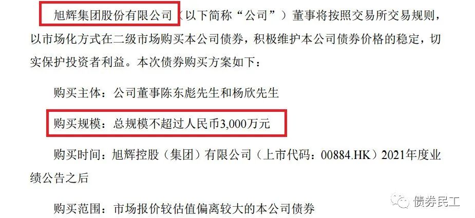 3、旭輝集團(tuán)股份有限公司于2022年3月21日公告,公司部分董事以市場(chǎng)化方式在二級(jí)市場(chǎng)購買不超過3000萬元本公司發(fā)行的公司債券。目前旭輝集團(tuán)存續(xù)債券7只,包括公司債券和中期票據(jù)。其中存續(xù)公司債券6只,存續(xù)公司債券金額為101.93億元。旭輝集團(tuán)最近一次發(fā)行債券是在2022年3月14日發(fā)行了規(guī)模為10億元的“22旭輝集團(tuán)MTN001”,票面利率4.75%。
