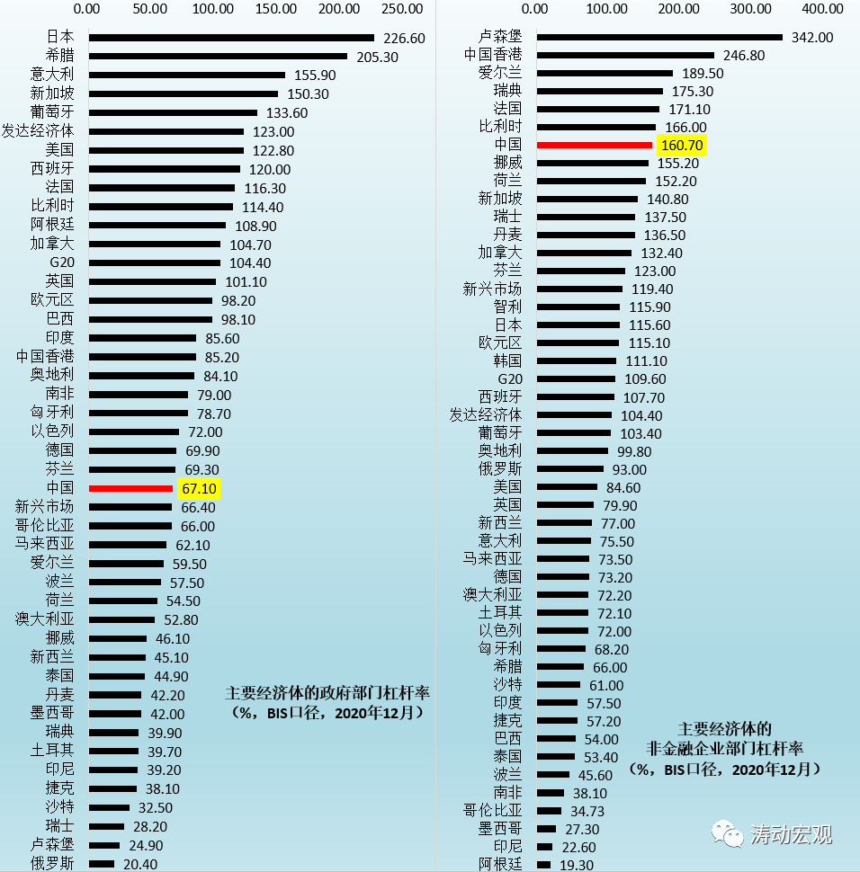 如果不考慮政府隱性債務,則中國政府部門的宏觀杠桿率處于可控位置,2020年12月為67.10%,和新興市場經濟體的66.40%以及德國的69.90%基本相當,低于印度的85.60%和美國的122.80%。