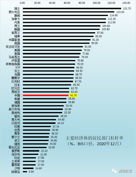 1、2020年12月中國居民部門的杠桿率為61.70%,和德國的58.80%基本相當,低于日本的65.30%和美國的79.50%,高于新興市場的53.90%。因此從數值上看似乎中國居民部門的宏觀杠桿率比較適中。但從央行公布的數據來看,BIS口徑下的居民部門杠桿率存在明顯低估,若以央行口徑來說,中國居民部門杠桿率2020年已達到72.50%,較美國僅低7個百分點。