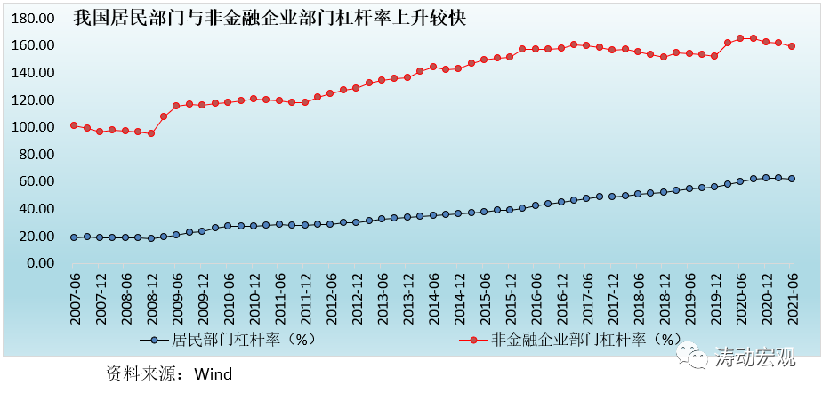 08年金融危機以來,我國非金融企業部門和居民部門的杠桿率上升較快。其中,居民部門杠桿率已從2008年的17.90%大幅升至2021年6月的62%,12年的時間里累計上升了44個百分點;非金融企業部門杠桿率則從2008年的95.20%大幅升至目前的158.80%,12年的時間里累計上升了63.60個百分點。