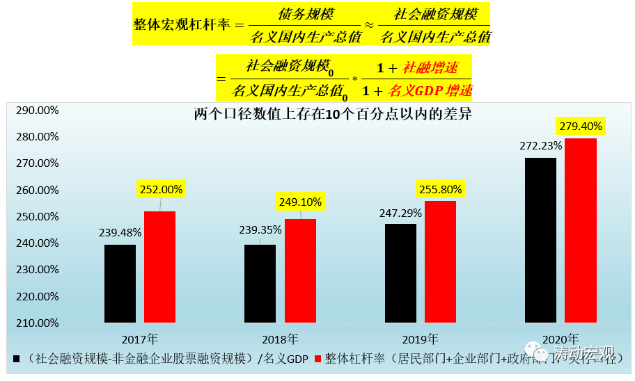 1、參照企業部門的杠桿率推算方式,宏觀部門杠桿率的變化主要由債務增長率和名義GDP增長率相對變化來決定,即只要債務融資(以扣掉股票融資后的社會融資規模代替)的增長率小于GDP的增長率,便可基本保證整個宏觀部門的杠桿率水平處于下降的過程,這實際上也是近年來政策層面一直強調“保持社會融資規模、貨幣供應量與名義經濟增速相一致”的大背景。