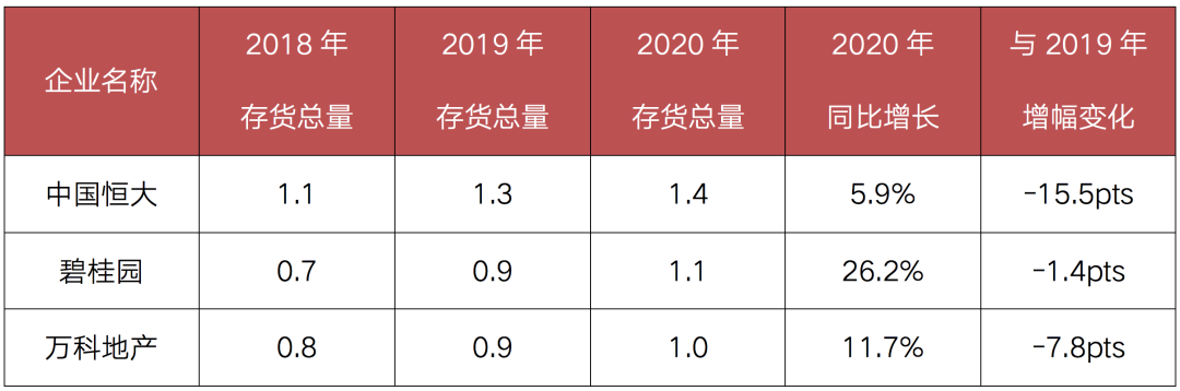 從企業(yè)角度而言,截至2020年底,存貨規(guī)模達(dá)到萬億的房企有三家,分別是恒大1.4萬億元、碧桂園1.1萬億元和萬科1萬億元,其中碧桂園和萬科是首次進(jìn)入萬億行列。