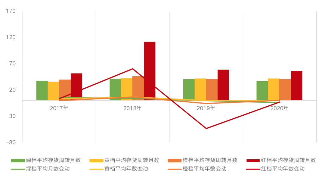 橫向比較來看,2020年紅檔房企的周轉(zhuǎn)速度最慢,平均存貨周轉(zhuǎn)月數(shù)在55.7個(gè)月,綠檔房企周轉(zhuǎn)速度最快,周轉(zhuǎn)月數(shù)達(dá)到了36.3個(gè)月。自2019年以來各檔位都在著手去庫存,尤其是紅檔房企下降最多,2020年仍在持續(xù)加快周轉(zhuǎn)速度。綠檔房企本身周轉(zhuǎn)速度就較快,在新規(guī)頒布后行動(dòng)敏銳,平均周轉(zhuǎn)月數(shù)下降了4.2個(gè)月;其次是紅檔房企,在2019年大幅加快周轉(zhuǎn)效率后,2020年持續(xù)提高周轉(zhuǎn)速度,平均存貨周轉(zhuǎn)月數(shù)較上年下降了3個(gè)月。