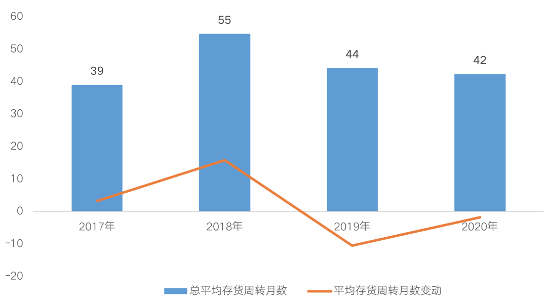 2019年房企增長(zhǎng)速度明顯放緩,市場(chǎng)整體去化承壓,行業(yè)視角回歸至去庫存。2020年,突遇新冠疫情,開工與施工進(jìn)度被推遲,隨著經(jīng)濟(jì)秩序逐漸恢復(fù),下半年以來房企積極趕工,全年存貨周轉(zhuǎn)天數(shù)較2019年進(jìn)一步縮短,平均存貨周轉(zhuǎn)月數(shù)為42個(gè)月(約3.5年),較上年下降1.8個(gè)月(約54天)。
