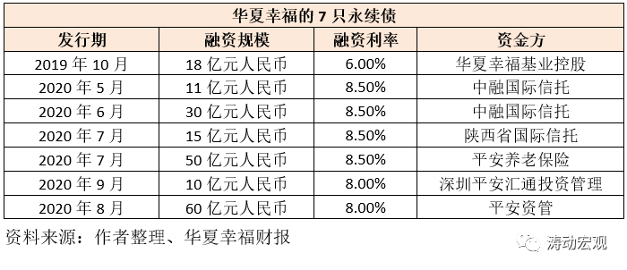 華夏幸福共有7只人民幣永續(xù)債,資金方共涉及平安、中融信托、陜西省國際信托以及其控股股東等主體。其中,6只永續(xù)債集中于2020年發(fā)行,中融信托向華夏幸福提供41億元人民幣融資(成本為8.50%)、平安系提供120億元人民幣融資(成本為8-8.50%)、陜西省國際信托提供15億元人民幣融資(成本為8.50%)以及華夏幸福基業(yè)控股提供18億元人民幣融資(成本為6%)。