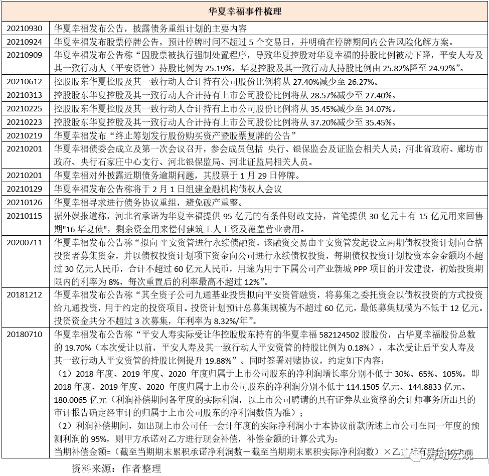 (一)雖然表面上看華夏幸福流動性危機始于2021年1月,但實際上早在2018年華夏幸福的困局便開始出現(xiàn),期間平安人壽及其一致行動人的加持一定程度上延緩了華夏幸福危機的爆發(fā),給華夏幸福帶來了一些希望。不過在2020年疫情及限購等政策影響下,華夏幸福面臨的困局進一步加劇,并爆發(fā)出目前市場所熟知的流動性危機。