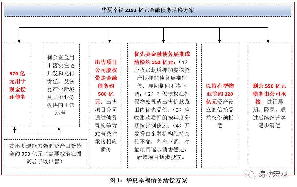華夏幸福約2192億元的金融債務(wù)清償方案基本上堅持“出售資產(chǎn)現(xiàn)金清償、債務(wù)跟隨項目走以及對部分債務(wù)進行展期、下調(diào)利率、豁免罰息”的原則。