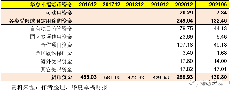 2018年以來,華夏幸福的貨幣資金呈逐年加快下滑的態(tài)勢,2017年貨幣資金余額為681.05億元,2018-2020年分別降至472.82億元、429.63億元和269.93億元,今年上半年進一步降至139.80億元。不過華夏幸福的貨幣資金中,大多受限,如截至今年上半年,華夏幸福可動用的貨幣資金實際上只有7.34億元。