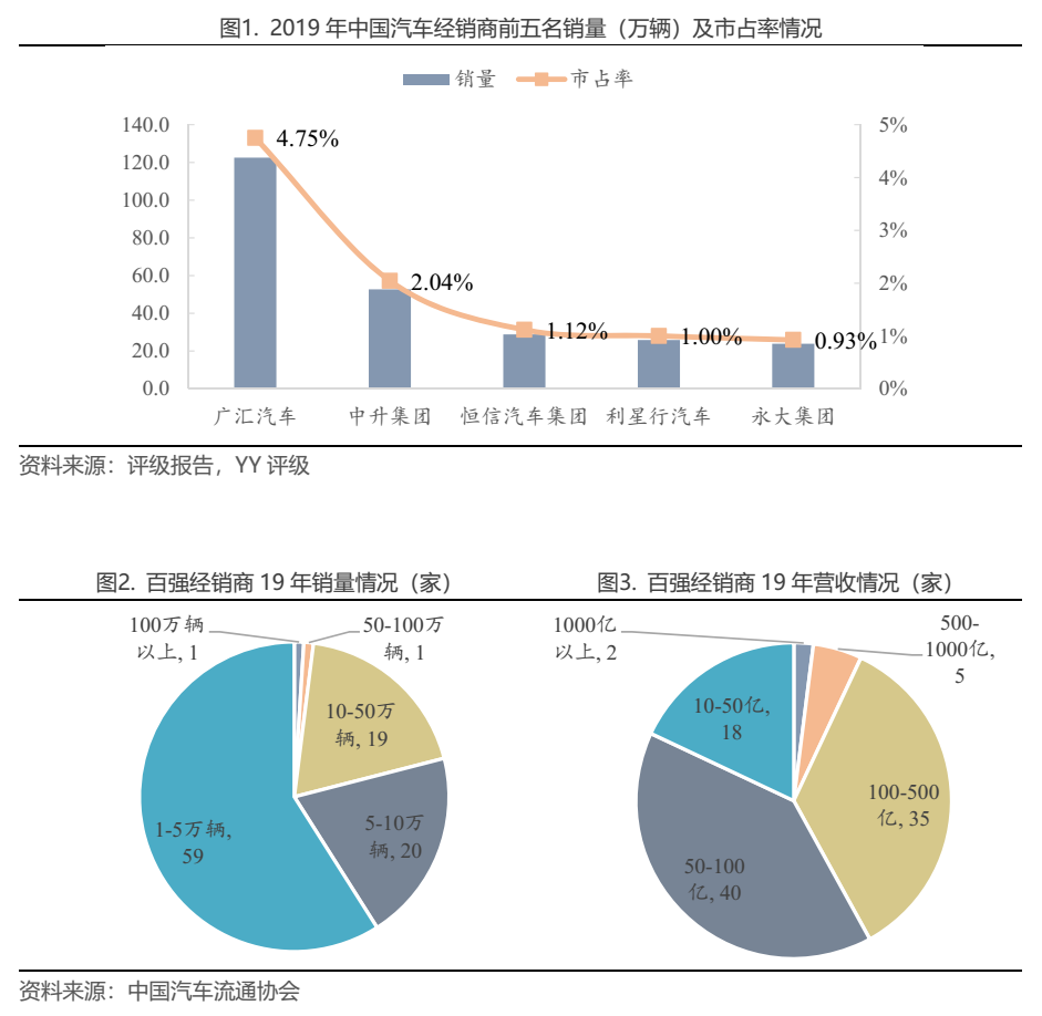 目前汽車經銷行業企業眾多、普遍規模小、集中度低,即使是行業龍頭,市場占有率也不高。2019年百強經銷集團共銷售車輛849.8萬臺,占全國乘用車總銷量的41.1%,前十強經銷商(按銷量排名)售出399.8萬輛,占全國乘用車銷量的19.3%。