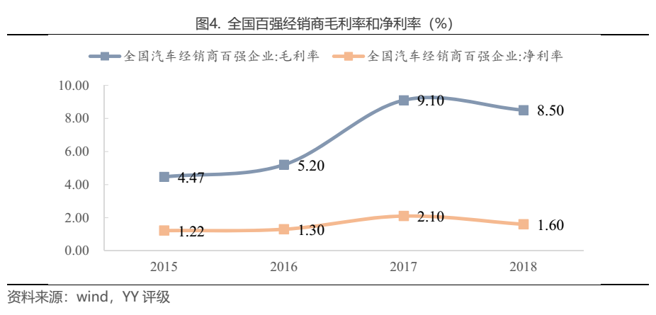 雖然新辦法打破了授權單一體制,但汽車廠商仍然通過供貨、返利等方式控制了銷售渠道,且會去4S店購車的人往往也是沖著官方授權以及汽車使用周期內的全方位服務體驗去的,因此品牌授權仍是4S店的主要銷售形式。當前汽車經銷商對于購銷兩頭的議價能力都較弱,廠商通常在制定指導零售價時給予經銷商 4~6%的購銷差價空間。由于行業競爭激烈,經銷商往往將大部分購銷差價讓利給客戶以爭奪客源,利潤空間進一步被壓縮,因此銷售利潤非常依賴于廠商后期提供的銷售返點,甚至出現為了獲得返利超負荷拿車、價格倒掛的情況。