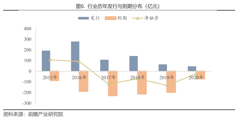 經歷2015年、2016年兩年大規模融資,自2017年以來,汽車銷售行業凈融資額持續為負,或與近些年來汽車銷售增速放緩,汽車銷售企業減緩拓展4S店的步伐,從而資金需求減弱所致。2020年,行業債券發行額與到期額均大幅減少,僅發行46.7億元(其中34億元都是由廣匯集團及其子公司發行),到期70.7億元,凈融資規模為-24.0億元。總體來說,債券市場對于汽車銷售行業并不友好。