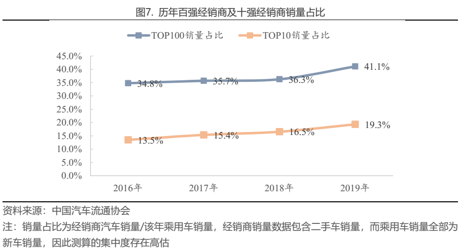 雖然目前汽車銷售行業仍呈現“大群體、小個體”的狀態,但近些年來的集中度提升是顯著的,尤其是前十名經銷商的集中度由2016年的13.5%提升至2019年的19.3%。