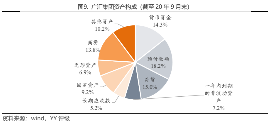 從汽車經銷公司的資產構成來看,若不考慮其他業務,則主要有貨幣資金、存貨、對上游廠商的預付款、廠商返利款等形成的其他應收款,4S店鋪、運輸工具等固定資產,土地使用權形成的無形資產。若4S店主要為租賃店,則資產流動性很強,非流動資產少,而若自持店較多,則固定資產、無形資產乃至在建工程等慢周轉的資產占比會更高。由于整車零售下游主要是個人,因此形成應收賬款、應收票據很少,僅有刷卡未到賬形成很少量應收賬款。另一方面,隨著汽車經銷商拓展融資租賃業務,也會形成融資租賃款,通常一年內到期的部分計入一年內到期的非流動資產,一年以上的部分計入長期應收款。另外,若歷史收購行為較多,賬上也可能累積大規模商譽,如廣匯集團賬上商譽達188.8億元,占總資產的比例達13.7%。