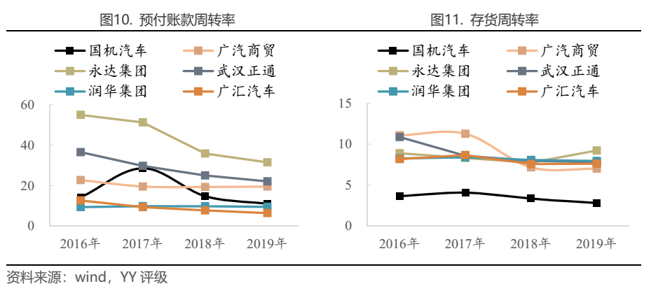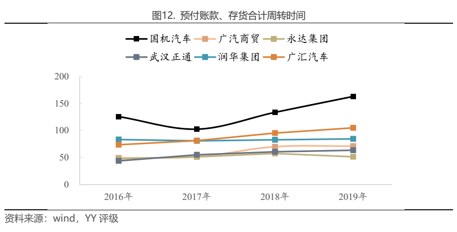 以預付賬款、存貨合計周轉時間即購銷完整周期來看(不考慮應收賬款),永達集團周轉時間最短,2019年為51.1天,廣汽商貿、武漢正通19年周轉時間也在80天內,而國機汽車周轉時間達162.8天,2017年以來周轉顯著減慢。6家企業平均周轉時間約3個月,若剔除國機汽車,周轉時間約2個半月。