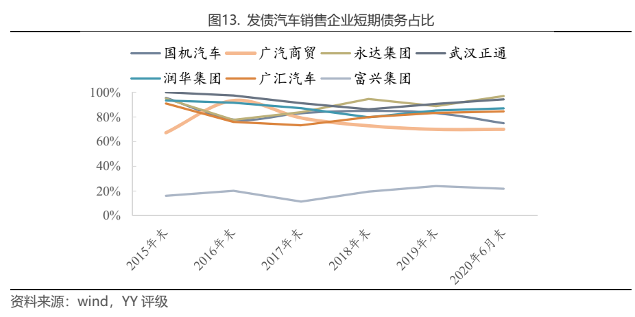 汽車銷售企業的債務結構呈現出高度短期化特征,7家發債汽車銷售企業中除富興集團外,其他企業的短期債務占比皆在70%以上,平均占比達到75.7%。短期化的融資安排部分是企業資質較弱、長期融資能力差所致,但更主要的是這與其資產期限結構是匹配的。汽車銷售企業最重要的資產構成為營運資本,包括貨幣資金以及汽車購銷中形成的預付款、存貨,流動性較強,上節計算出預收+存貨的合計周轉時間在2.5個月-3個月左右,因此理想的融資結構是用短期債務為這些營運資本融資。且汽車銷售利潤空間本來就窄,用短債替換長債節省財務成本也是必要的。