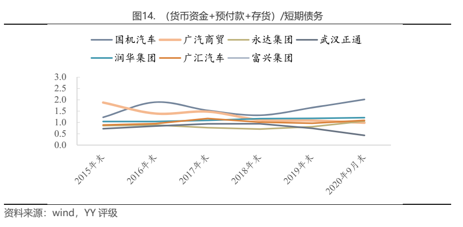 幾家發債企業中,除富興集團(貨幣資金+預付款+存貨)/短期債務高達4左右外(富興集團汽車銷售業務僅展比44.7%,還有房地產等業務,可比性較差),其他企業的(貨幣資金+預付款+存貨)/短期債務基本在0-2范圍,其中廣汽商貿、永大集團、潤華集團、廣匯汽車皆保持在1左右,說明債務期限結構與資產期限結構較匹配。而截至20年9月末國機汽車該指標達到2.02,短期安全系數較高,而武漢正通該指標下滑至0.43,缺口達51.36億元,意味著其存在以短債滾續為固定資產、融資租賃款等長期限資產融資的情況,短期償債壓力較大。