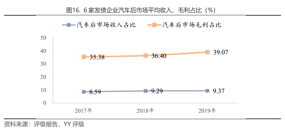 6家發債企業平均來看,汽車后市場以約10%的收入占比貢獻了約40%的毛利。且近些年來,無論是收入占比還是毛利占比,都呈現穩步提升的態勢。