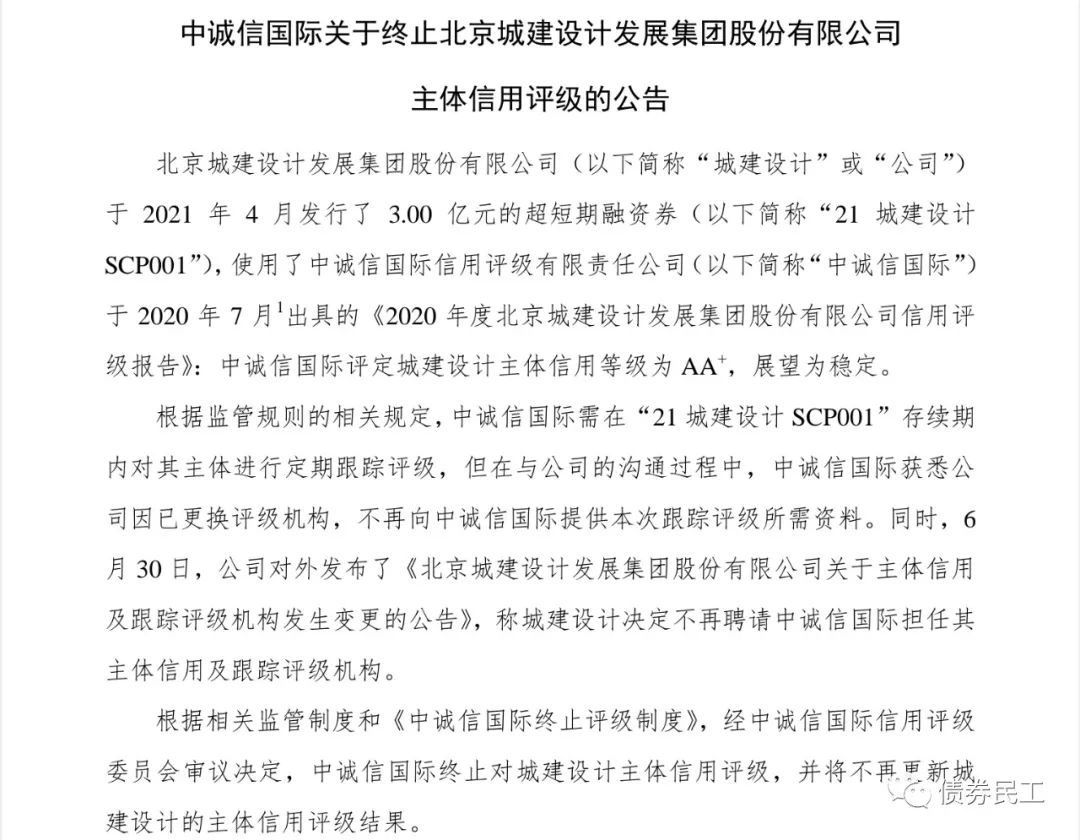 1、2021年7月8日,中誠信國際公告,終止北京城建設(shè)計發(fā)展集團股份有限公司(以下簡稱“城建設(shè)計集團”)主體信用評級報告,主要原因是發(fā)行人已經(jīng)更換了評級機構(gòu),不再向中誠信國際提供跟蹤評級所需材料。