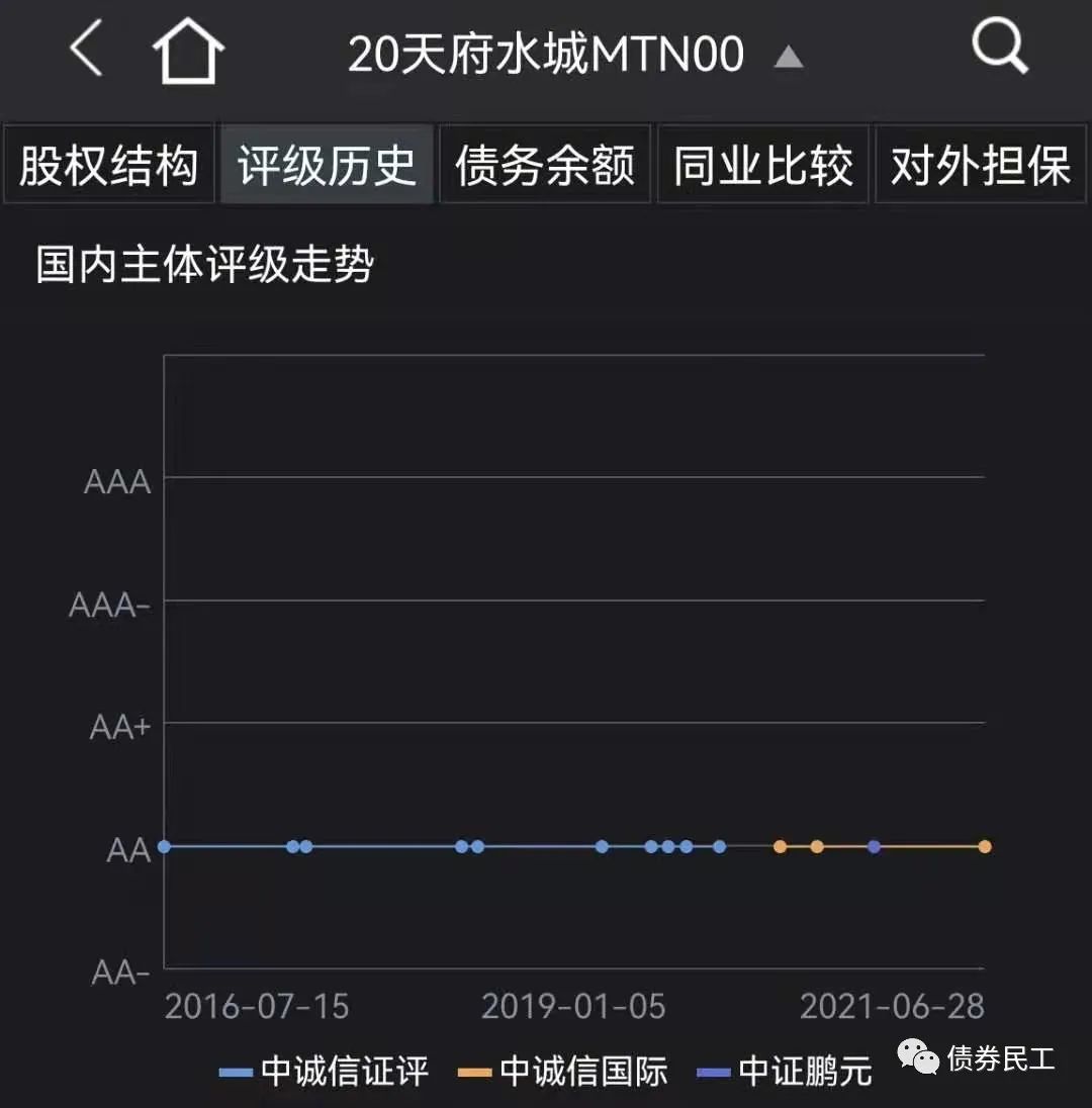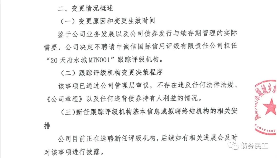 2、成都天府水城城鄉(xiāng)水務(wù)建設(shè)有限公司(以下簡稱“天府水城”)于2021年7月8日披露了《關(guān)于擬變更跟蹤評級機構(gòu)和延期披露相關(guān)債券 2021 年跟蹤評級報告的公告》,“鑒于公司業(yè)務(wù)發(fā)展以及公司債券發(fā)行與存續(xù)期管理的實際需求”,不再聘任中誠信國際為跟蹤評級機構(gòu),但是天府水城目前尚未確認新的跟蹤評級機構(gòu)。預(yù)計中誠信國際后續(xù)也會出具相應(yīng)的公告。