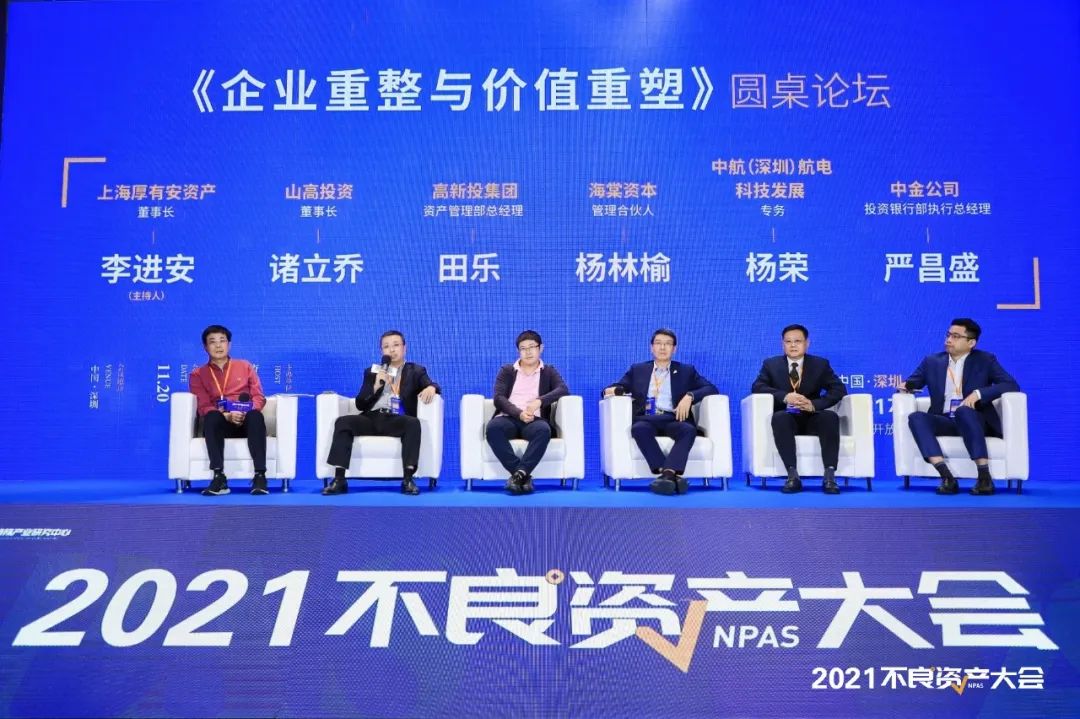 大會第一場圓桌:《企業(yè)重整與價值重塑》由上海厚有安資產(chǎn)董事長李進安主持,與山高投資董事長諸立喬 、高新投集團資產(chǎn)管理部總經(jīng)理田樂、海棠資本管理合伙人楊林榆、深航電專務(wù)楊榮、中金公司投資銀行部執(zhí)行總經(jīng)理嚴(yán)昌盛一起對話。