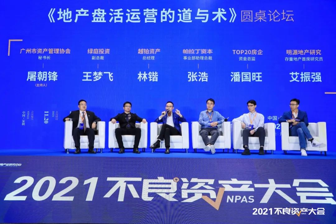 大會第二場圓桌《地產(chǎn)盤活運營的道與術(shù)》由廣州市資產(chǎn)管理協(xié)會秘書長屠朝鋒主持,與綠庭投資副總裁王夢飛、越鉑資產(chǎn)總經(jīng)理林鍇、帕拉丁資本事業(yè)部助理總裁張浩、TOP20房企資金總監(jiān)潘國旺、明源地產(chǎn)研究 存量地產(chǎn)首席研究員艾振強一起對話。