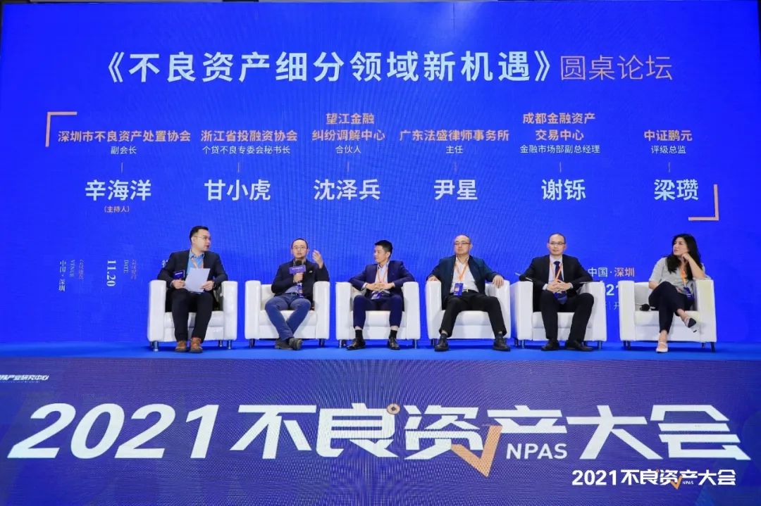 大會最后一場圓桌《不良資產(chǎn)細分領(lǐng)域新機遇》,由深圳不良資產(chǎn)處置協(xié)會副會長辛海洋主持,與浙江省投融資協(xié)會個貸不良專委會秘書長甘小虎、望江金融糾紛調(diào)解中心合伙人沈澤兵、廣東法盛律師事務(wù)所主任尹星、成都金融資產(chǎn)交易中心金融市場部副總經(jīng)理謝鑠、中證鵬元評級總監(jiān)梁瓚一起對話。