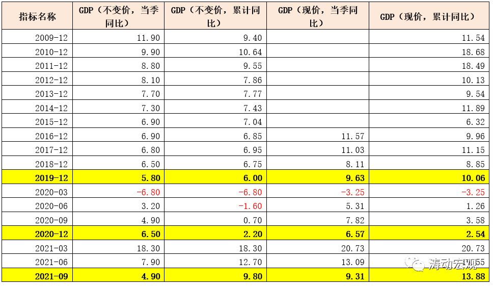相較于2020年的V型修復,2021年經濟則呈現出典型的“倒V型”下行態勢,今年二季度以來經濟下行壓力開始逐漸凸顯。所以我們看到,政策層面實際上自今年三季度開始,呈現出逐步放松的跡象。數值上看,今年一季度、二季度和三季度當季經濟同比增速分別為18.30%、7.90%和4.90%,兩年平均增速(當季值)分別為5.00%、5.50%和4.90%,考慮到四季度經濟下行壓力仍在持續(預計四季度當季增速可能會降至4.50%),基于此粗略判斷2021年全年經濟增速在8%左右(已超過兩會制定的6%以上目標),兩年平均增速預計為5.0%。