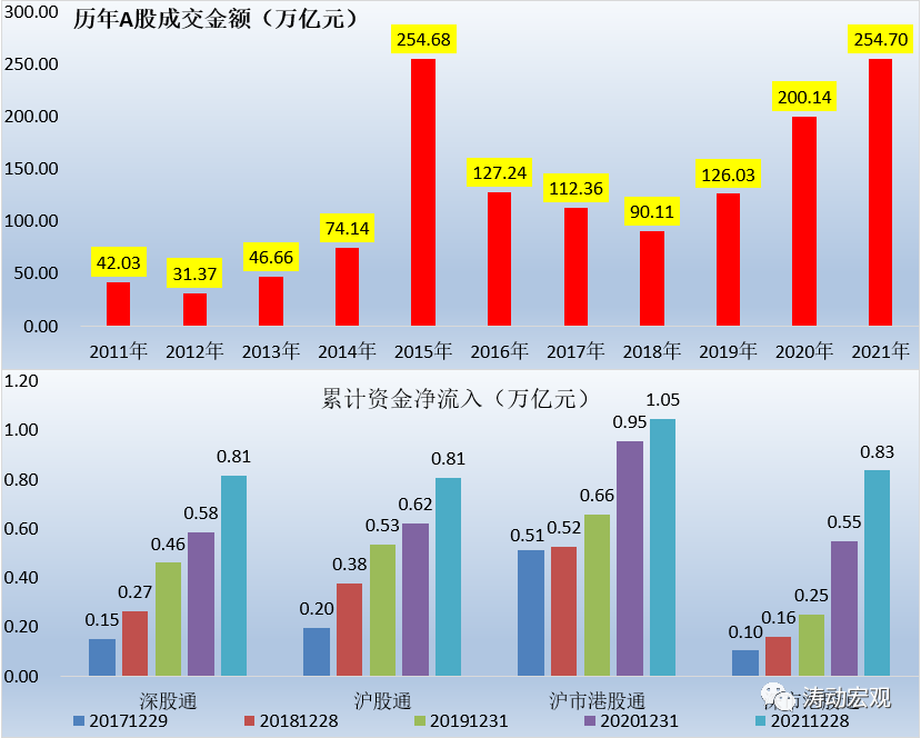 (4)注冊制將于2022年在A股市場全面實施,有助于增強A股市場的吸引力。從成交量來看,2021年的A股市場表現較為活躍,為A股持續處于慢牛行情中打下了堅實基礎。具體看,2021年以來A股全年成交量已經達到254.70萬億元,突破2015年創下的歷史高點,且2019年以來成交量連續三年上升。