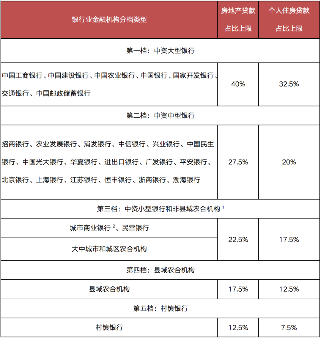 從近期發布的《房地產貸款集中度管理要求》的具體要求來看,銀行業金融機構按類型分檔,其房地產貸款占比上限各檔不高于40%、27.5%、22.5%、17.5%及12.5%;個人住房貸款占比上限各檔不高于32.5%、20%、17.5%、12.5%、7.5%。