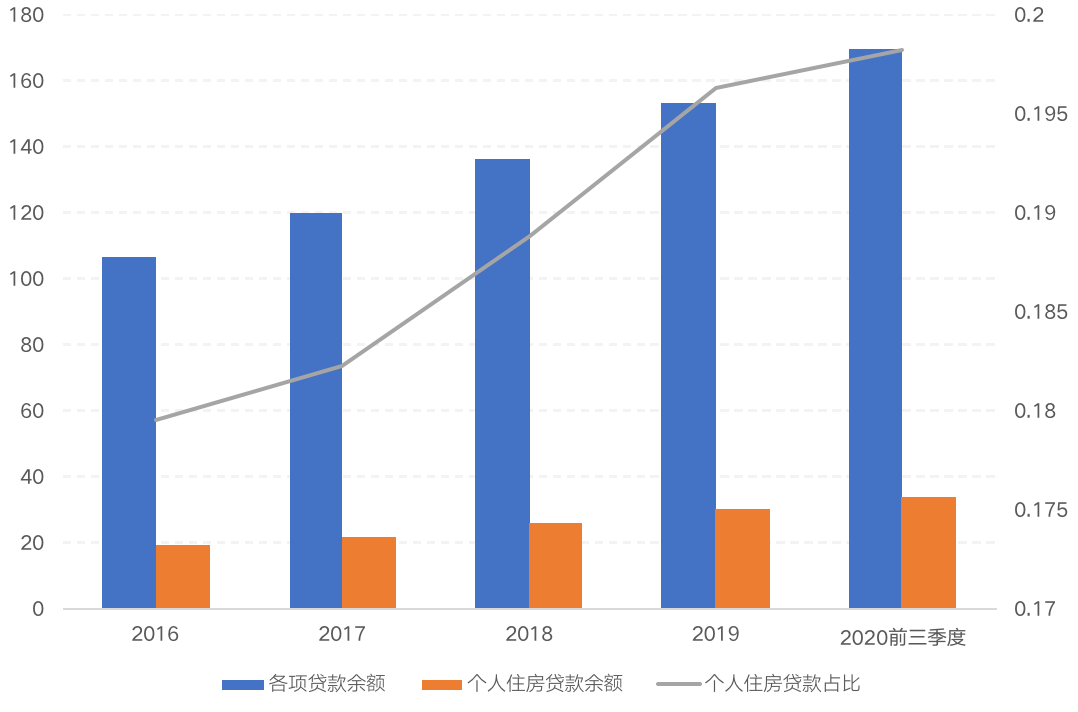 從個人住房貸款占比來看,2020年三季度末,個人住房貸款余額33.59萬億元,個人住房貸款占比約19.83%,低于“房地產貸款集中度管理要求”中“第一檔:中資大型銀行”、“第二檔:中資中型銀行”32.5%及20%占比上限。