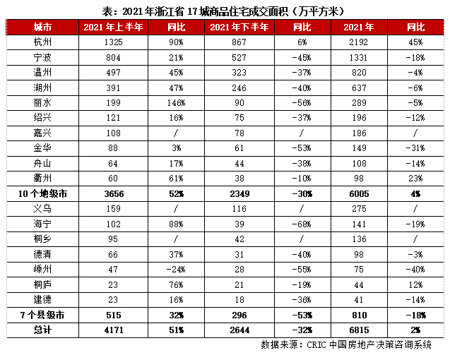 2021年上、下半年,浙江省房地產市場強、弱轉折,上半年市場異常火爆,下半年則持續轉冷。據CRIC監測數據顯示,上半年浙江省10個地級市商品住宅成交3656萬平方米,同比增長52%,7個縣級市成交515萬平方米,同比增長32%。其中,杭州、海寧等成交顯著放量,同比漲幅都在90%附近,麗水更是翻倍增長。下半年10個地級市成交跌至2349萬平方米,同比下降30%;7個縣級市成交降至296萬平方米,同比下降53%。其中,金華、海寧等市場持續低迷,成交同比腰斬。