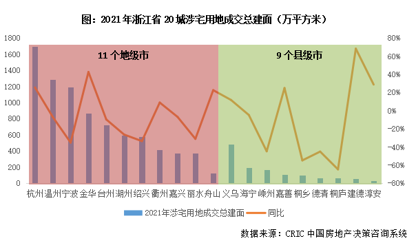 展望2022年,浙江省房地產市場前景很大程度上將取決于供求關系,聯系到近兩年浙江省涉宅用地成交規模持續下行,預計房地產市場仍將實現供求平衡。2021年,浙江省11個地級市涉宅用地成交總建面8230萬平方米,同比下降10%,9個縣級市涉宅用地成交總建面1262萬平方米,同比下降21%。