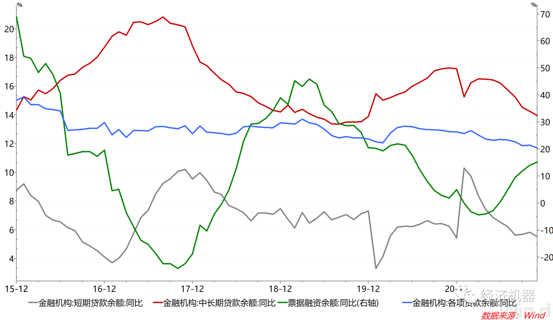 3)余額同比看,人民幣貸款增速與上月基本持平,有初步企穩的跡象。11月,各項貸款余額同比增長11.7%,較上月微跌0.02個百分點,2021年2月份以來增速持續回落的態勢得到緩解。分項來看,中長期貸款余額同比增速持續下滑,票據融資同比增速持續走高,表明信貸結構變化趨勢延續。
