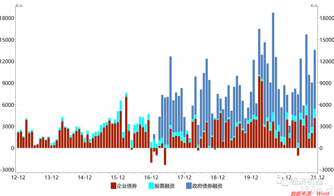 4)新增社會融資總額中,政府債券融資和企業債券融資是同比多增的主要拉動項。11月新增社會融資總額2.61萬億元,同比多增4745億元。其中,政府債券融資新增8158億元,同比多增4158億元,企業債券融資新增4104億元,同比多增3264億元,是新增社會融資同比多增的主要拉動因素。