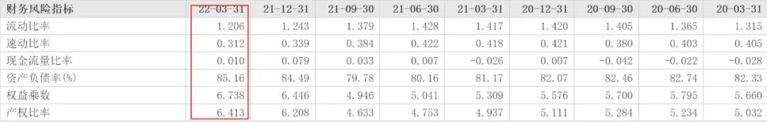 2022年1季報,榮盛發展的財務風險指標仍在上升,其中資產負債率為85.16%,比2021年末增加;